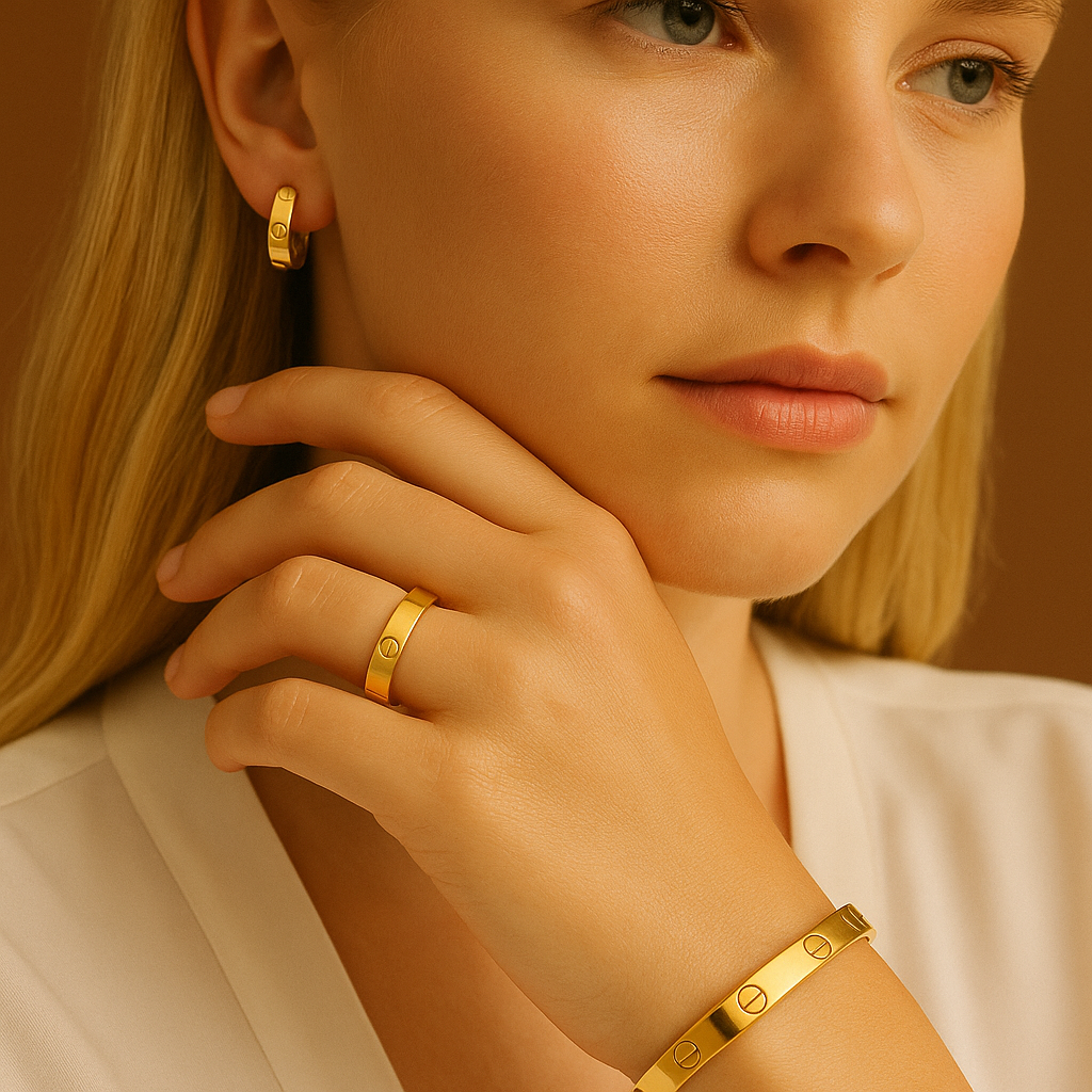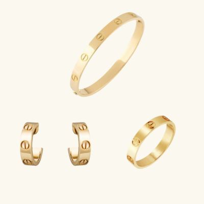 Een krachtige, minimalistische set bestaande uit een armband, oorbellen en ring – elk met de herkenbare schroefdetails die tijdloze klasse uitstralen. Deze iconische combinatie staat voor pure elegantie en modern design, perfect voor wie houdt van subtiele luxe en verfijning in elke beweging.